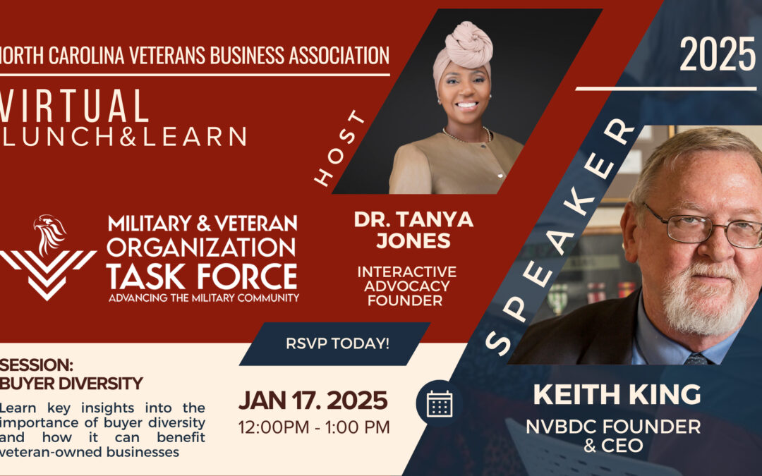 The NC Veteran Business Association, a proud NVBDC Military & Veteran Organization (MVO) Task Force partner, is hosting a compelling Monthly Lunch and Learn featuring Keith King, Founder and CEO of the National Veteran Business Development Council (NVBDC). This session will explore the critical role of buyer diversity and how it empowers veteran-owned businesses to thrive in today’s competitive marketplace.