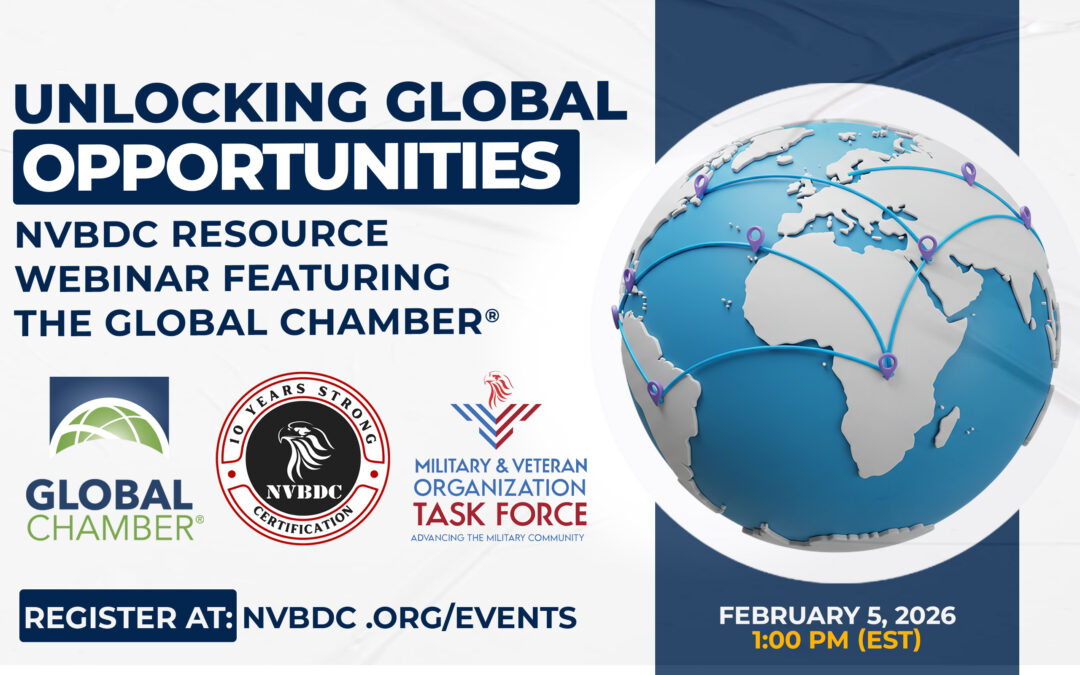 Participants in the February 5 Resource Webinar will gain actionable insight into what global growth really looks like for veteran-owned businesses. Topics will include an overview of Global Chamber’s services and international network, how veteran-owned firms can prepare for global opportunities, and how NVBDC-certified businesses can leverage partnerships beyond the United States.